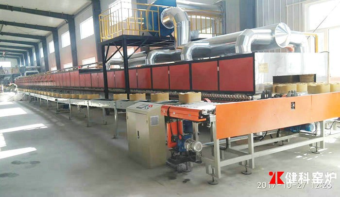輥道窯的燃燒室在輥子的下方,用壓縮空氣霧化重油、柴油、煤油等燃料進行燃燒。也有用煤氣發(fā)生爐所產(chǎn)煤氣進行燃燒的,比較大型的陶瓷廠大都采用雙段冷煤氣站,使用冷靜煤氣進行燃燒,產(chǎn)生高溫。燃燒室與輥道之間,有耐火材料隔離,火焰不直接接觸被燒制的產(chǎn)品。相對來說,煤氣發(fā)生爐配套輥道窯燃燒比重油、柴油等成本低,比直接燃煤效率高環(huán)保達標(biāo)。使用重油為燃料時,為防止煙氣污染制品,要采取隔焰或半隔焰形式。電熱時,為保護發(fā)熱體或使溫度更均勻,也需將發(fā)熱體和制品隔開。